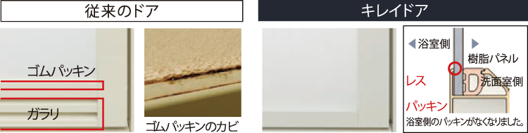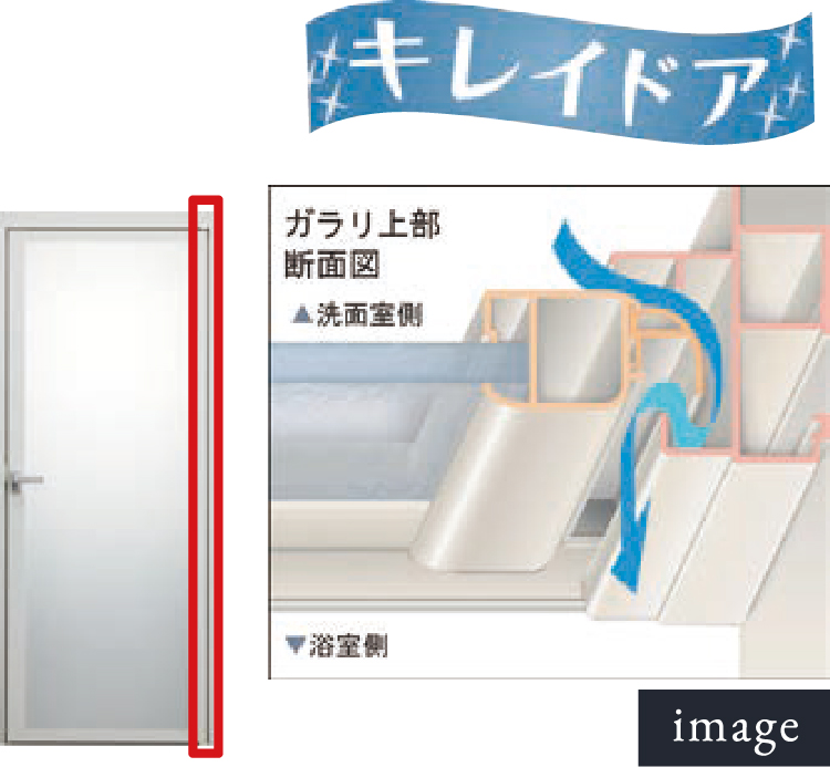 カビやすい浴室側のゴムパッキンをなくし、汚れがたまりやすいドア下部のガラリをタテ型に配置して、汚れにくいドアを実現。 パッキンレスのフラット形状になり、お掃除の負担も大幅に軽減。