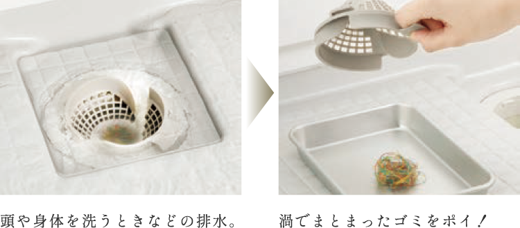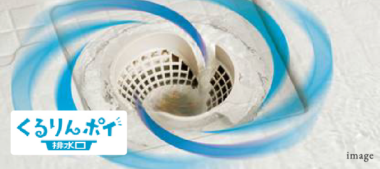 くるりんポイが排水口が進化!シャワーなどの排水時に渦を起こして、髪の毛やゴミをヘアキャッチャーの中央にパッとまとめます。