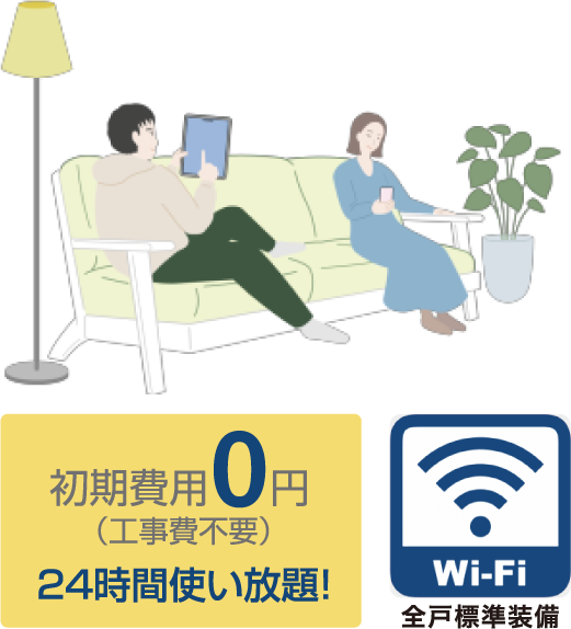 ギガプライズのインターネットサービスMyAgentは、最大上下1Gbps※(ベストエフォート)のインターネットが使い放題。 インターネットサポートは安心の24時間365日。インターネットの申込み手続きは不要です。お引越し当日よりご利用いただけます。 また、専有部内はWi-Fiルーターを標準装備、無線接続が可能。無線対応のパソコン、スマートフォンなど住戸内でご利用いただけます。